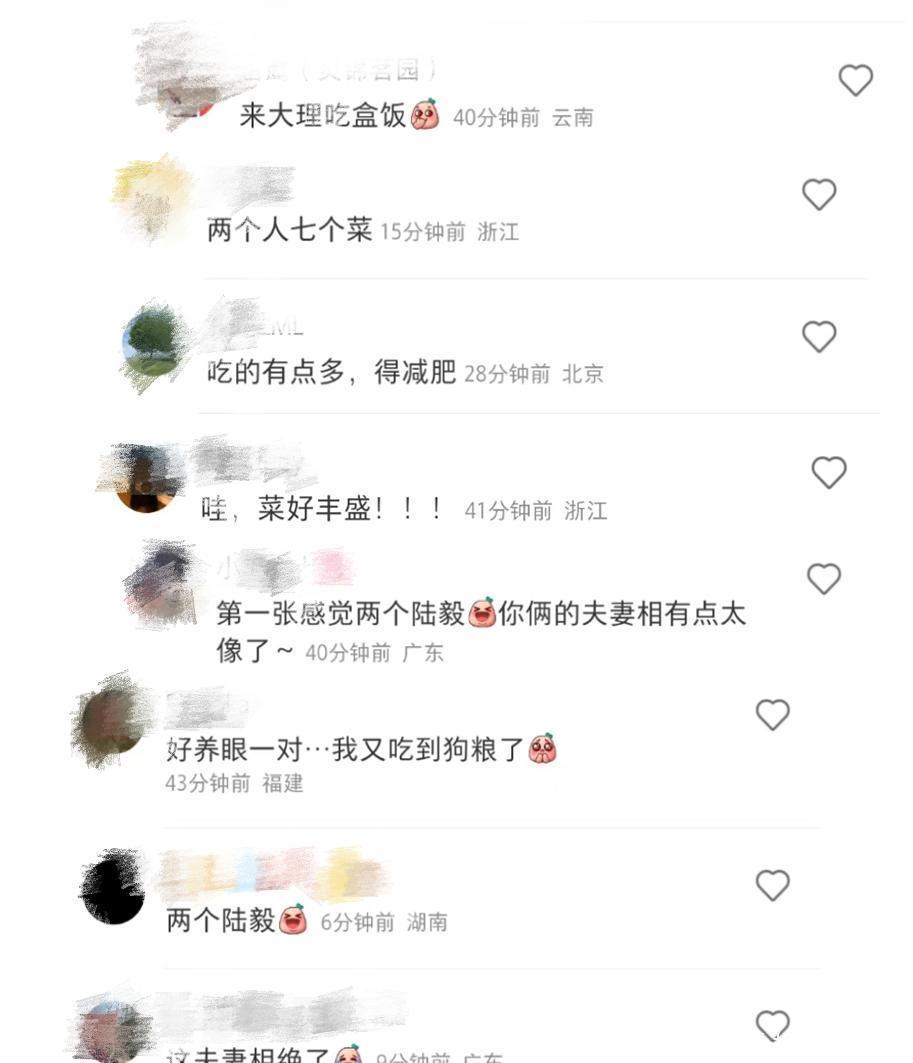 看到陆毅的发文和晒照后,有网友就给佳耦俩安利当地的好意思食,也有东说念主被两东说念主的佳耦相给惊艳到了,直呼“第一张嗅觉两个陆毅,你俩的佳耦相有点太像了”。另外,看到陆毅和鲍蕾一顿吃七菜一汤后,网友们也直言:“两个东说念主七个菜”“吃的有点多,得减肥”“哇好丰盛”。