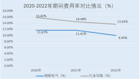 同时,明阳电气同业业可比公司白云电器、三变科技、特变电工、金盘科技、北京科锐的时候用度率均值差别为15.82%、14.48%、13.62%。